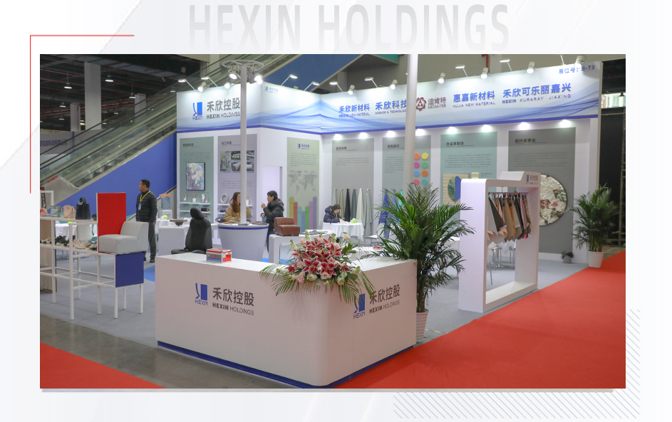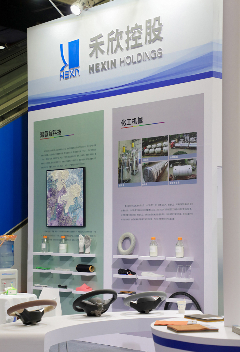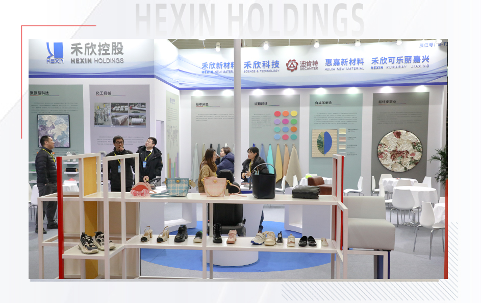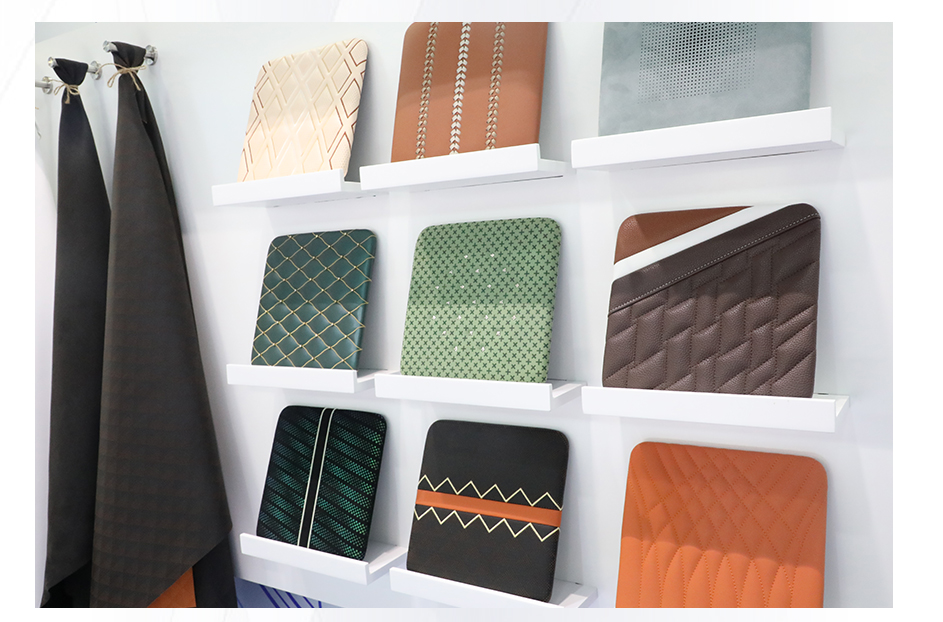 禾欣展臺(tái)B-T3位于會(huì)展中心中軸線,占據(jù)了展會(huì)C位。展臺(tái)以開放式布局體現(xiàn)開放、包容的展陳理念;藍(lán)、白主調(diào)輔以淺綠、淺灰、淺咖等淺色系,傳達(dá)出簡(jiǎn)約、舒適的視覺效果。展板清晰展示了聚氨酯科技、化工機(jī)械、基布染整、絨面超纖、合成革、超纖皮等主營(yíng)業(yè)務(wù),令參觀者一目了然。三幅皮革畫作既傳達(dá)了綠色環(huán)保理念,也為展會(huì)增添藝術(shù)氣息。展品除了豐富的皮革掛樣外,成品展示區(qū)還陳列了汽車內(nèi)飾、沙發(fā)、箱包、鞋靴、運(yùn)動(dòng)、電子包裝等的應(yīng)用場(chǎng)景。